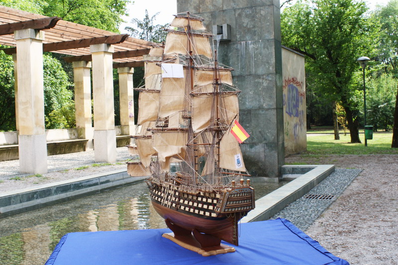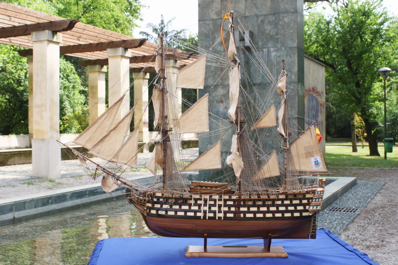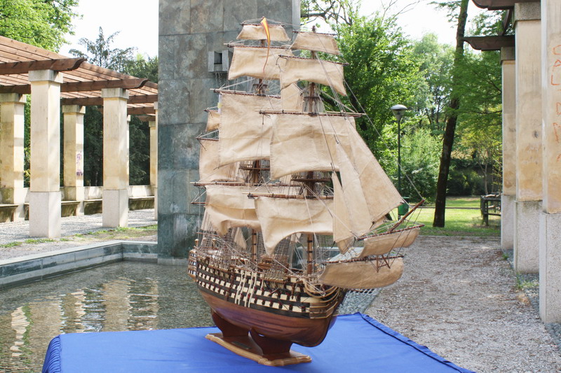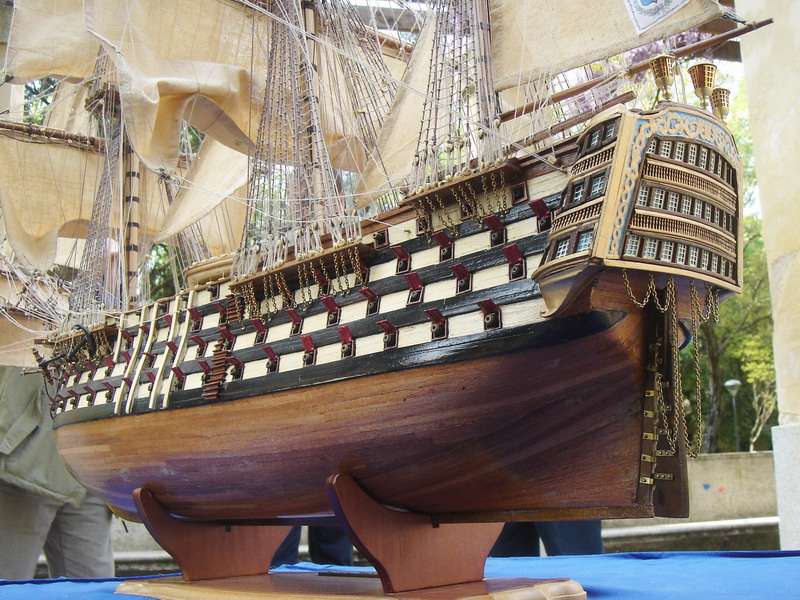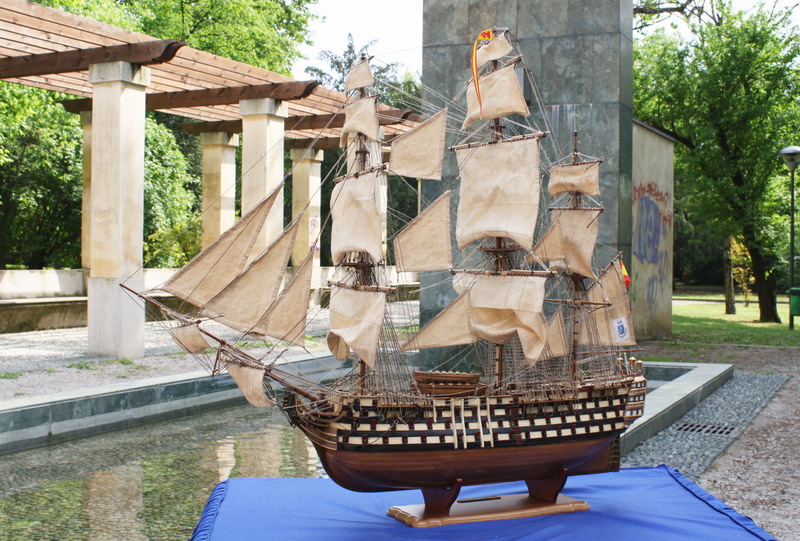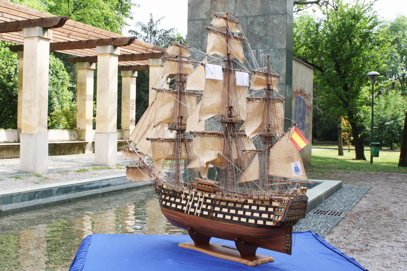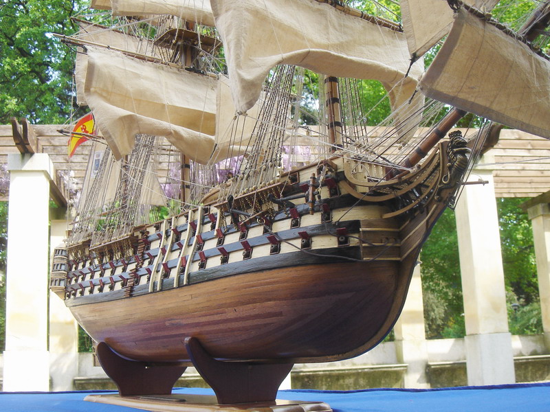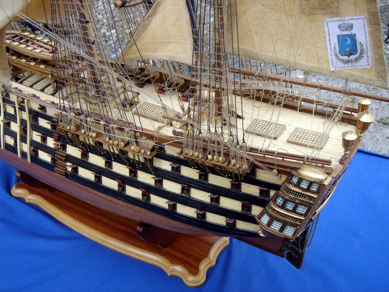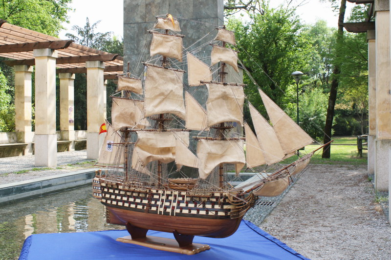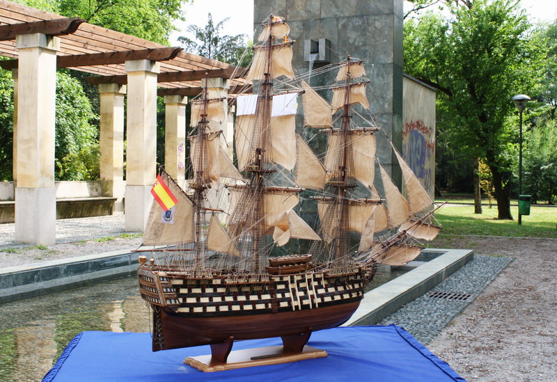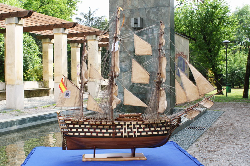 La Santisima Trinidad era un vascello spagnolo inizialmente a tre ponti, varato a La Havana, Cuba, nel 1769. Nel primo allestimento contava 112 cannoni, poi aumentati a 130 e infine a 140 grazie alla creazione di un quarto ponte, ma poi ridotti ancora a 130. Anche se sul numero finale dei cannoni si hanno informazioni incerte, nell’ultima versione essa era ancora considerata il più grande e armato vascello da guerra a quattro ponti del mondo e nella storia è rimasta come il più famoso dei pochi vascelli a quattro ponti mai costruiti. Nella guerra dichiarata nel luglio del 1779 all’Inghilterra dalla Spagna, unitasi alla Francia impegnata nella guerra d’indipendenza americana, la SS.Trinidad prese parte come nave ammiraglia della flotta spagnola a operazioni congiunte nel canale della Manica. Dopo aver partecipato nel 1782 al secondo assedio di Gibilterra e alla battaglia non decisiva di Cape Spartel venne modificata con l’aggiunta del quarto ponte e di 8 cannoni. Nel febbraio del 1797 partecipò alla battaglia di Cape St. Vincent, dove venne seriamente danneggiata dopo di che riuscì a sfuggire fortunosamente agli Inglesi, rifugiandosi a Cadice per le riparazioni. Il 21 ottobre 1805 prese parte con la flotta francese alla battaglia di Trafalgar. Data la difficoltà di manovra, dovuta alla sua rilevante massa e a causa della debolezza del vento in quella giornata, venne a mancare il contributo della SS.Trinidad alla causa della flotta ispano-francese. Le sue grandi dimensioni e la sua stessa posizione assunta sul campo di battaglia la fecero subito oggetto dell’attacco concentrato di numerosi vascelli inglesi. Gravemente danneggiata, fu costretta ad arrendersi. Il giorno successivo, durante una tempesta, mentre era rimorchiata, imbarcò acqua e affondò.