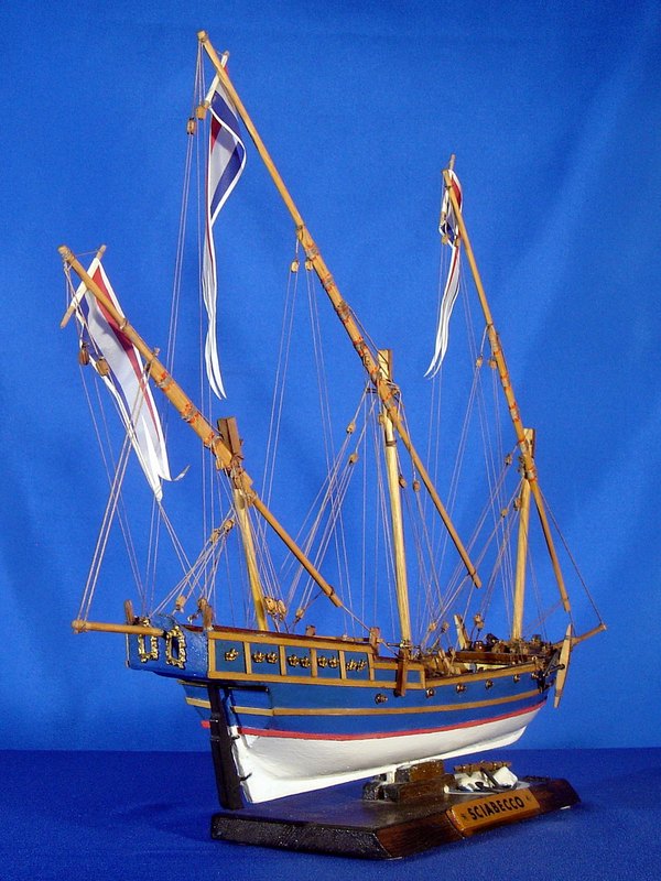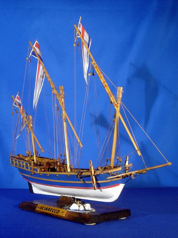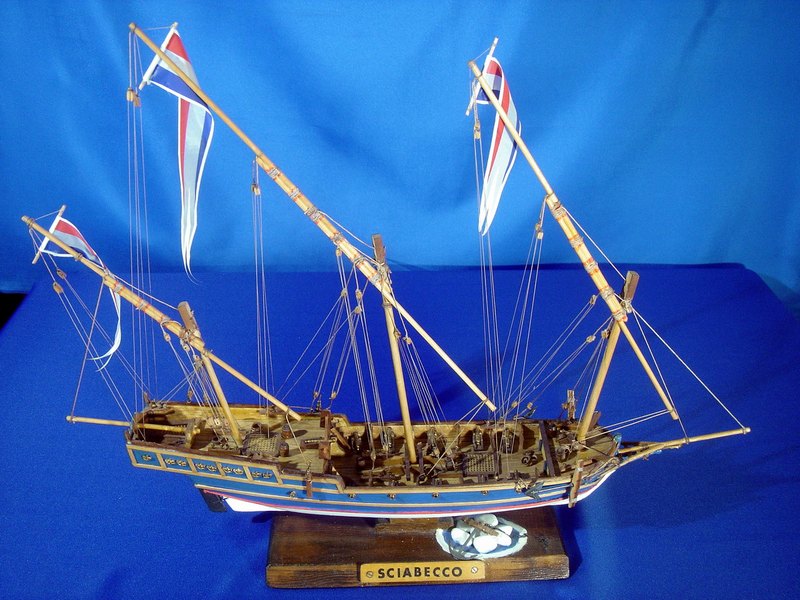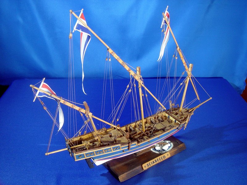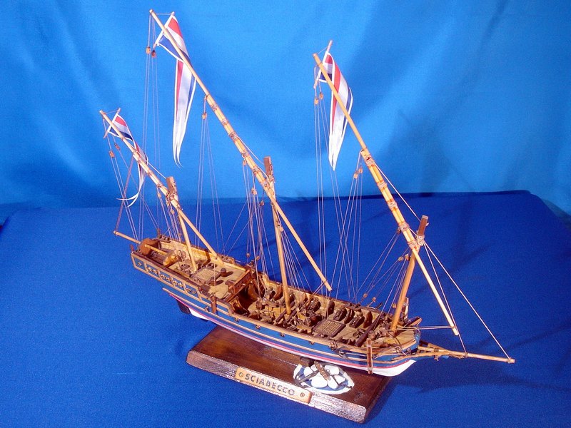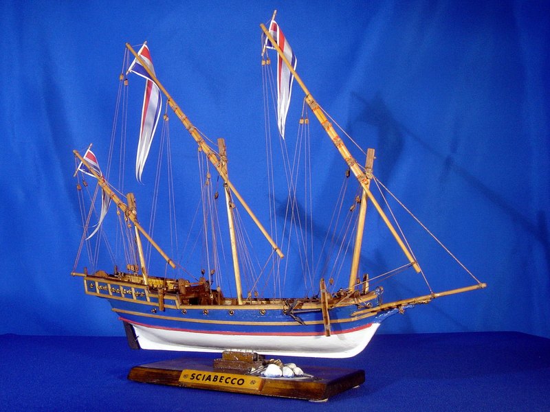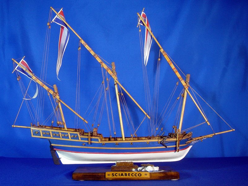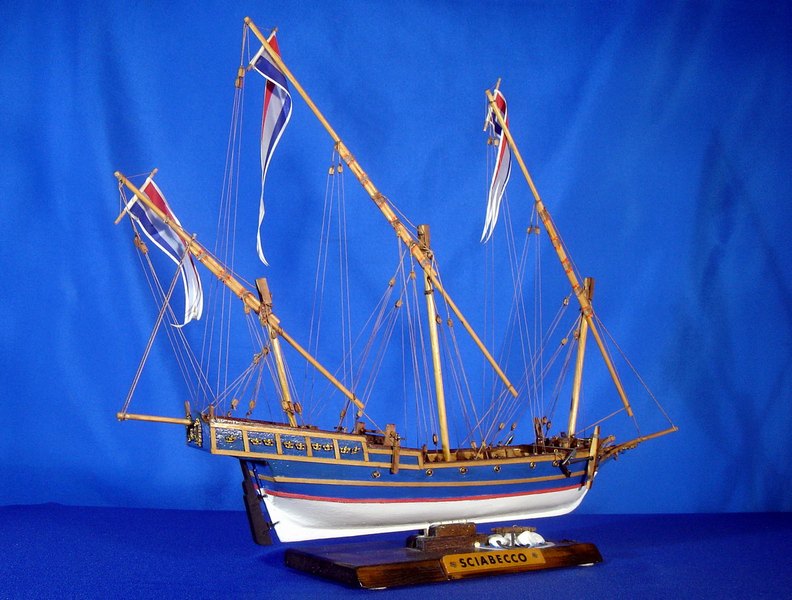 Lo Sciabecco era un veliero derivato dalle imbarcazioni arabe (prenderebbe il nome dall’arabo “chabbak”) adibite originariamente alla pesca, ma poi anche alla pirateria. Si sviluppò e venne impiegato a partire dal XIV secolo dalle marine europee prevalentemente nel Mediterraneo. Per le sue doti di velocità e maneggevolezza, veniva utilizzato nella guerra di corsa, ma anche per il trasporto merci. Nella forma iniziale aveva tre alberi con vele latine e fiocco teso fra bompresso e albero di trinchetto. Era dotato di remi, che consentivano la navigazione anche in mancanza di vento e che, per la loro lunghezza fino a 8 m, puntati sui fondali bassi favorivano le manovre in porto. Il massimo periodo di diffusione fu nel settecento. La marina francese per iniziativa del suo Ministro Antoine-Louis de Rouillè commissionò ai cantieri di Tolone i primi esemplari di sciabecco, varati nel 1751, aventi dislocamento di 150 e 260 tonnellate e armati con rispettivamente 18 e 24 cannoni da 6 pollici. Visti i buoni risultati ottenuti, ne seguirono altri ordinativi. L’allestimento dello sciabecco intanto si evolveva nel tempo. Nel corso del diciottesimo secolo, il trinchetto viene raddrizzato e si aggiunge anteriormente un bompresso con fiocco: è lo sciabecco “mistic” (alla polonnaise ). Nella stessa epoca, in Francia e in Italia, per adattare lo sciabecco a nave mercantile, la vela latina dell’albero maestro viene rimpiazzata con due o tre vele quadre e talvolta si adotta in aggiunta la soluzione “mistic”. Queste modifiche rendono però lo sciabecco più lento, tanto da farlo scomparire poco a poco dal Mediterraneo.