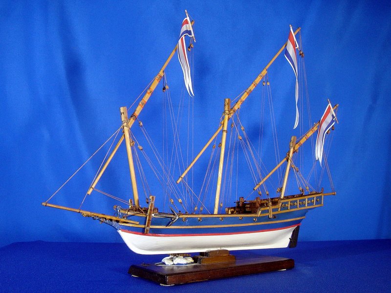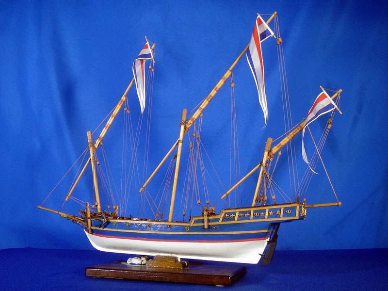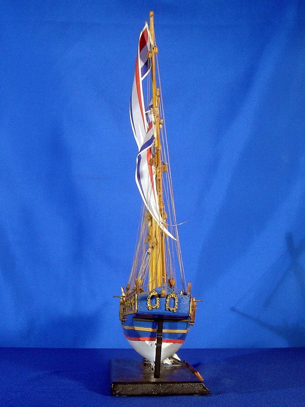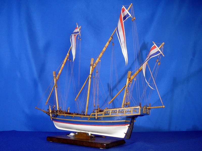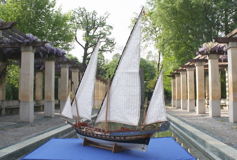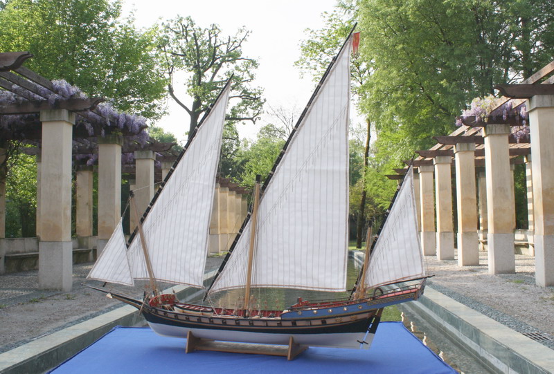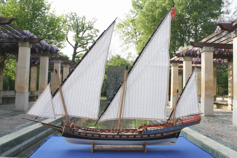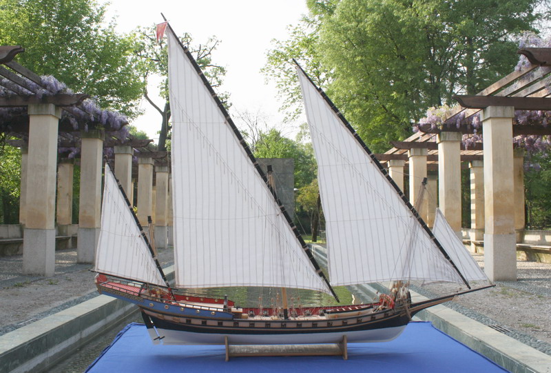 Lo Sciabecco era un veliero derivato dalle imbarcazioni arabe (prenderebbe il nome dall’arabo “chabbak”) adibite originariamente alla pesca, ma poi anche alla pirateria. Si sviluppò e venne impiegato a partire dal XIV secolo dalle marine europee prevalentemente nel Mediterraneo. Per le sue doti di velocità e maneggevolezza, veniva utilizzato nella guerra di corsa, ma anche per il trasporto merci. Nella forma iniziale aveva tre alberi con vele latine e fiocco teso fra bompresso e albero di trinchetto. Era dotato di remi, che consentivano la navigazione anche in mancanza di vento e che, per la loro lunghezza fino a 8 m, puntati sui fondali bassi favorivano le manovre in porto. Il massimo periodo di diffusione fu nel settecento. La marina francese per iniziativa del suo Ministro Antoine-Louis de Rouillè commissionò ai cantieri di Tolone i primi esemplari di sciabecco, varati nel 1751, aventi dislocamento di 150 e 260 tonnellate e armati con rispettivamente 18 e 24 cannoni da 6 pollici. Visti i buoni risultati ottenuti, ne seguirono altri ordinativi. L’allestimento dello sciabecco intanto si evolveva nel tempo. Nel corso del diciottesimo secolo, il trinchetto viene raddrizzato e si aggiunge anteriormente un bompresso con fiocco: è lo sciabecco “mistic” (alla polonnaise ). Nella stessa epoca, in Francia e in Italia, per adattare lo sciabecco a nave mercantile, la vela latina dell’albero maestro viene rimpiazzata con due o tre vele quadre e talvolta si adotta in aggiunta la soluzione “mistic”. Queste modifiche rendono però lo sciabecco più lento, tanto da farlo scomparire poco a poco dal Mediterraneo.