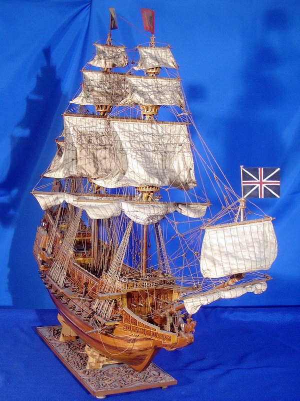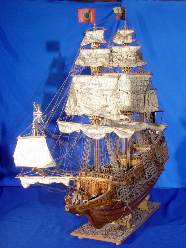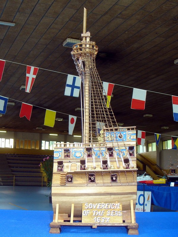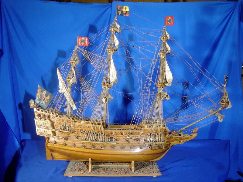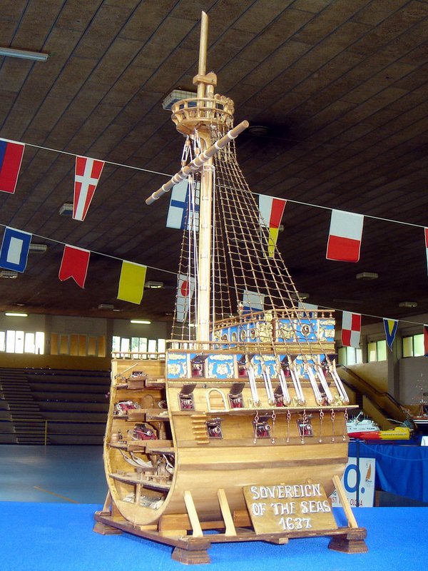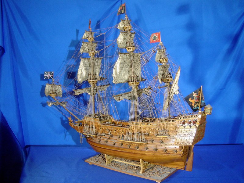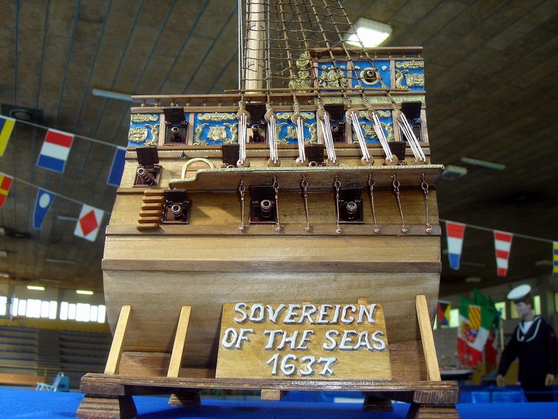 La Sovereign of the Seas, progettata nel 1634 da Phileas Pett e costruita nel 1637 per ordine di re Carlo I, era la prima nave da guerra a tre ponti con 102 cannoni. Essi erano realizzati in bronzo anziché in ghisa, risultando così più leggeri. La Sovereign of the Seas era una delle più belle navi dell’epoca e dagli olandesi era chiamata il “diavolo d’oro” peri suoi colori. La costruzione della nave faceva parte del piano di Carlo I per contrastare con la potenza della marina inglese principalmente gli olandesi e gli spagnoli. Suo primo impegno fu nel1652 nella battaglia di Kent Knoch, nella guerra contro l’Olanda, dove si dice abbia affondato una nave olandese con una sola bordata. Quando nel 1660 salì al trono Calo II la nave, dopo un restauro, fu rinominata Royal Sovereign. Tra il 1666 e il 1673 fu impegnata in diverse battaglie durante la seconda e terza guerra olandese. Nella guerra della Grande Alleanza contro la Francia (1689-1699) la Royal Sovereign partecipò a fianco degli olandesi alle battaglie di Beachy Head nel1690 e Barfleur nel1692. La carriera di questa nave ebbe però una brusca fine nel 1696 quando accidentalmente prese fuoco nel bacino di carenaggio a Chatam.