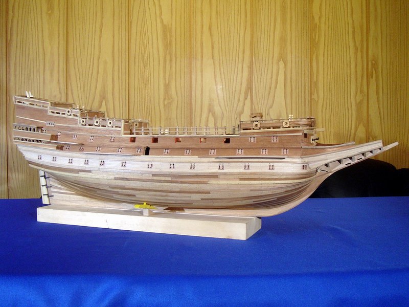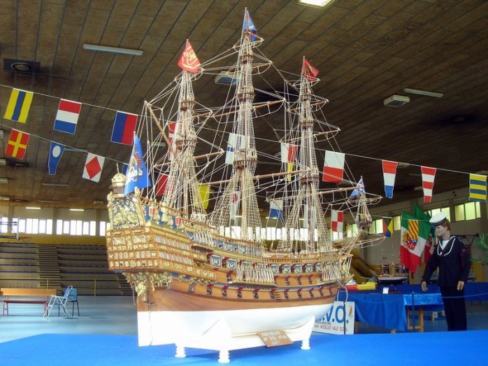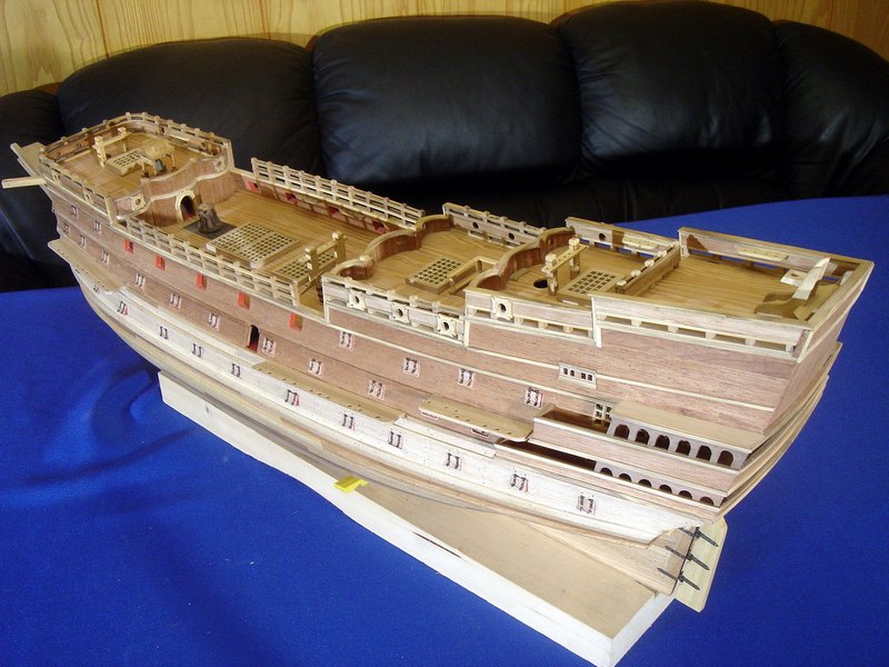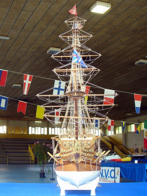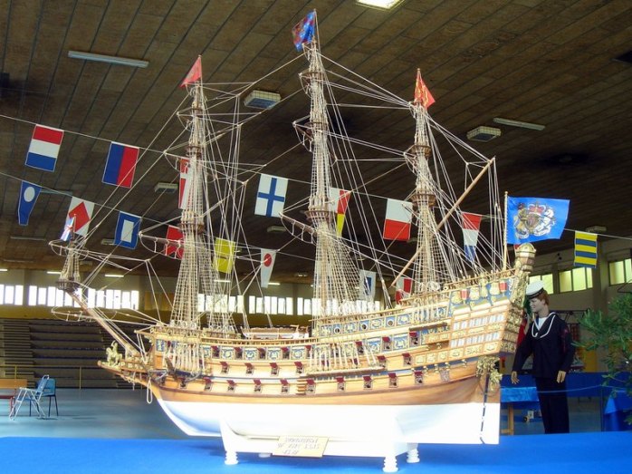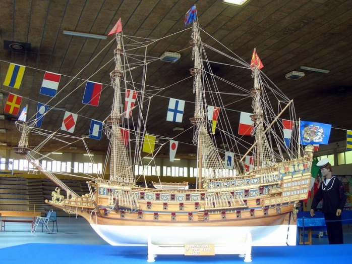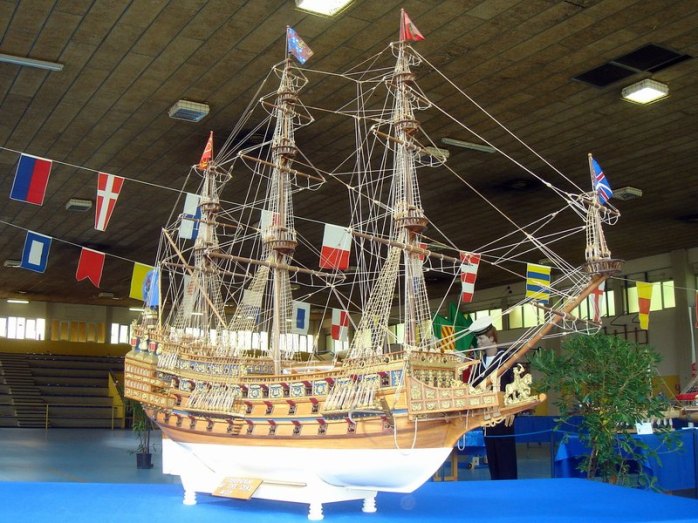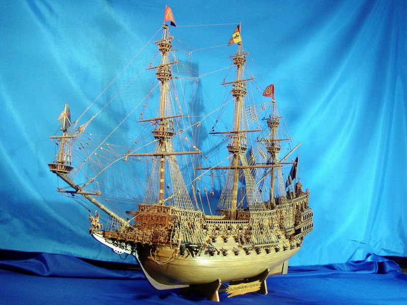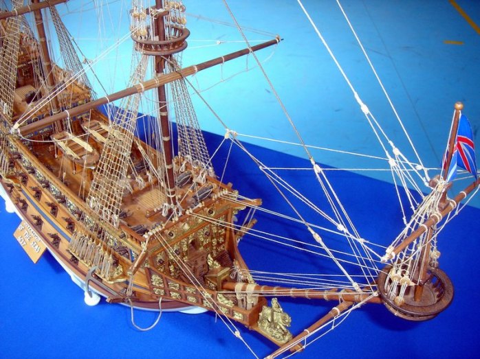La Sovereign of the Seas, progettata nel 1634 da Phileas Pett e costruita nel 1637 per ordine di re Carlo I, era la prima nave da guerra a tre ponti con 102 cannoni. Essi erano realizzati in bronzo anziché in ghisa, risultando così più leggeri. La Sovereign of the Seas era una delle più belle navi dell’epoca e dagli olandesi era chiamata il “diavolo d’oro” peri suoi colori. La costruzione della nave faceva parte del piano di Carlo I per contrastare con la potenza della marina inglese principalmente gli olandesi e gli spagnoli. Suo primo impegno fu nel1652 nella battaglia di Kent Knoch, nella guerra contro l’Olanda, dove si dice abbia affondato una nave olandese con una sola bordata. Quando nel 1660 salì al trono Calo II la nave, dopo un restauro, fu rinominata Royal Sovereign. Tra il 1666 e il 1673 fu impegnata in diverse battaglie durante la seconda e terza guerra olandese. Nella guerra della Grande Alleanza contro la Francia (1689-1699) la Royal Sovereign partecipò a fianco degli olandesi alle battaglie di Beachy Head nel1690 e Barfleur nel1692. La carriera di questa nave ebbe però una brusca fine nel 1696 quando accidentalmente prese fuoco nel bacino di carenaggio a Chatam.