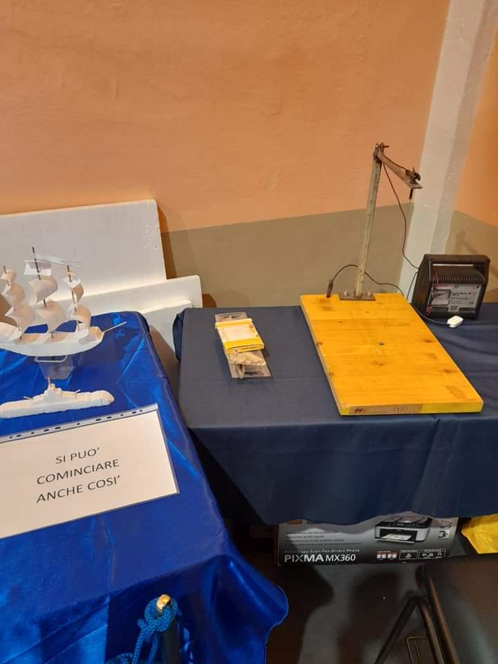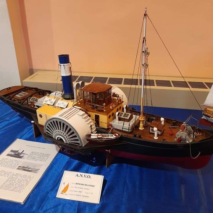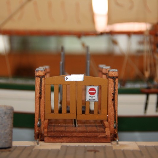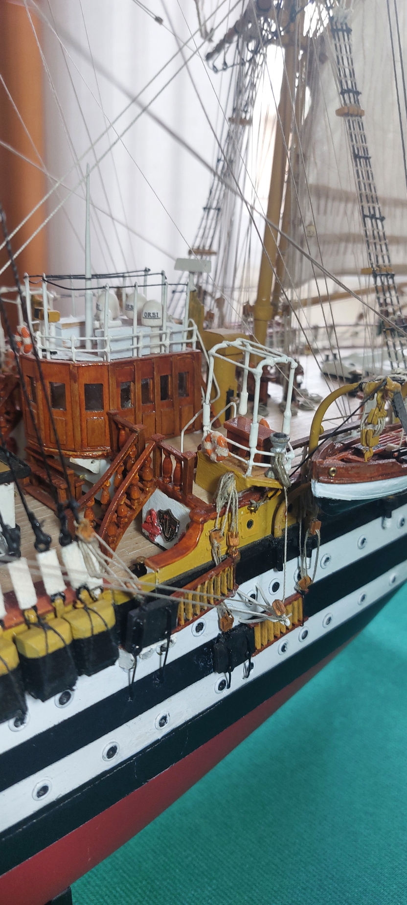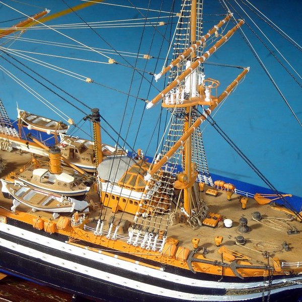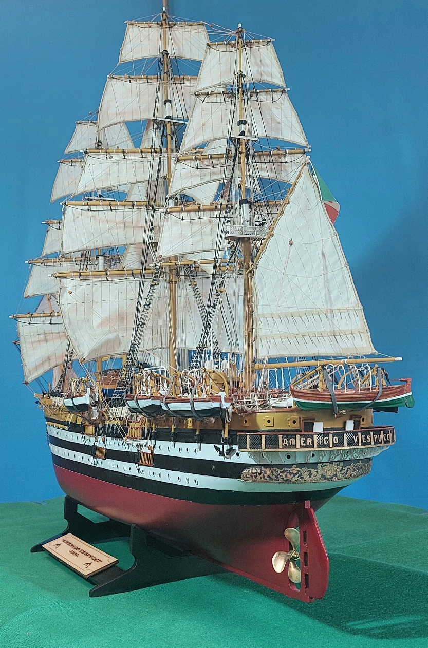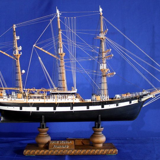 Io sono riuscito in corso d’opera e non con poche difficoltà, ad applicare la corretta inclinazione. Per la costruzione di questo modello, tengo a precisare che sono stati utilizzati alcuni componenti provenienti da kit di montaggio, fra questi, tagli laser, incisione e fregi, tutto il resto è auto costruito manualmente, facendo molta attenzione ai particolari delle foto e filmati della Nave Originale. La caratteristica di questo modello è quella di essere stato realizzato con i pennoni orientabili a seconda del vento. In questo caso, con mure a sinistra. Lo scafo e stato realizzato a doppio fasciame, il primo in listelli di tiglio incollati internamente fra la chiglia e le ordinate con garza di rinforzo, il secondo in noce nazionale. Tutto lo scafo prima della verniciatura è stato trattato con soluzione spy Sistar per eliminare anche le più piccole imperfezioni e rifinito con carta vetrata 320/500. Per la verniciatura ho utilizzato smalto acrilico professionale spry. Tutte le imbarcazioni quali; lance, motoscafi, motolance e baleniera sono state realizzate con listelli di bosso opportunamente rastremati.